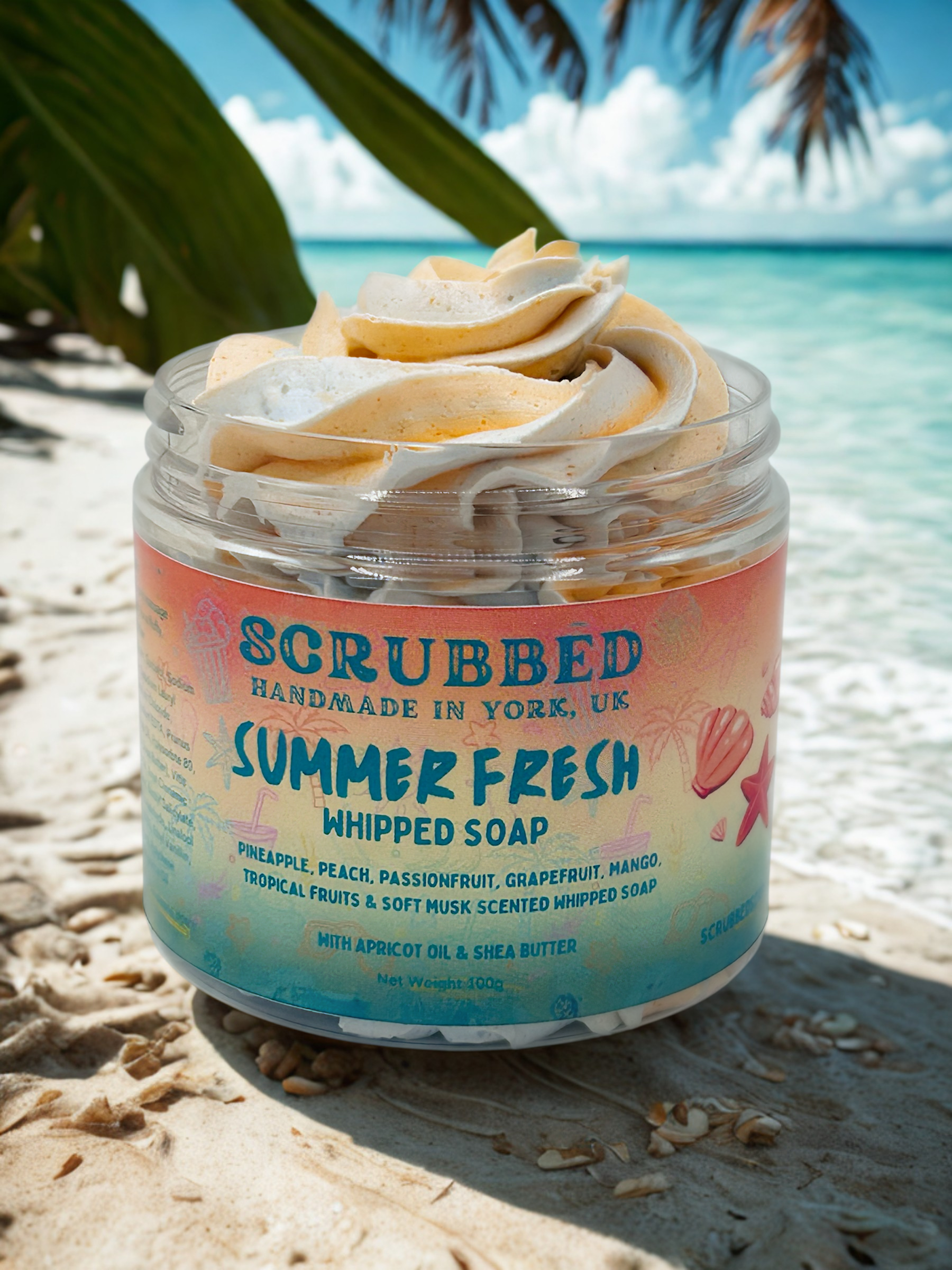 Awaken your senses and lather in sunshine with Summer Fresh, a vibrant whipped soap that captures the essence of a perfect Summer day. Fluffy, smooth and ultra-nourishing, this tropical treat gently cleanses whilst leaving your skin soft, refreshed and deliciously scented. Juicy, bright, and irresistably fruity, Summer Fresh bursts open with notes of ripe pineapple, luscious peach, tangy passionfruit and zesty grapefruit. A heart of sweet mango and a medlay of tropical fruits is softened by a gentle creamy musk. Enriched with nourishing shea butter and apricot oil, this soap is truly versatile and can be used as a hand soap, body wash or even a shaving cream.